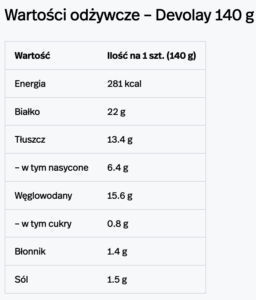 Produkt zawiera gluten, jaja oraz mleko. Przygotowywany w lokalu, w którym wykorzystuje się również seler i gorczycę.
