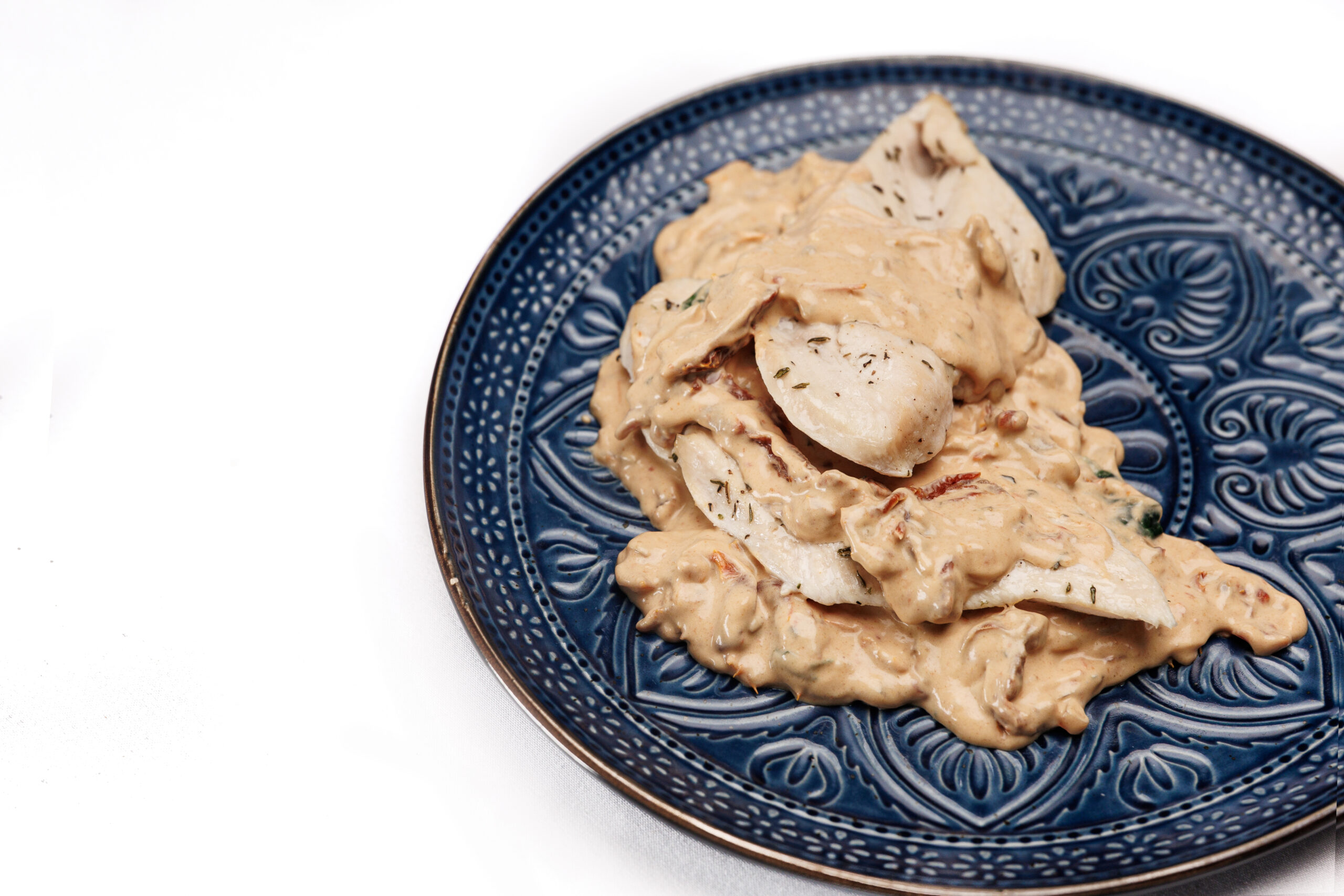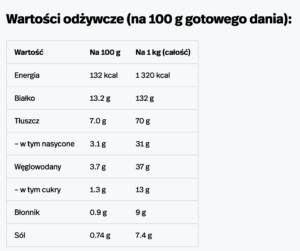 Soczysta pierś z kurczaka duszona w aromatycznym sosie śmietanowym z mascarpone, świeżym szpinakiem, suszonymi pomidorami i odrobiną białego wina. Całość wzbogacona jest kremowym parmezanem i nutą świeżych ziół. Delikatne mięso z zanurzeniem w aksamitnym, wyrazistym sosie tworzy wyjątkową kompozycję smaków inspirowaną kuchnią Toskanii. Ten aromatyczny sos idealnie pasuje do klusek śląskich, ryżu bądź puszystego puree ziemniaczanego, wprowadzając powiew śródziemnomorskiej kuchni na Twój stół.