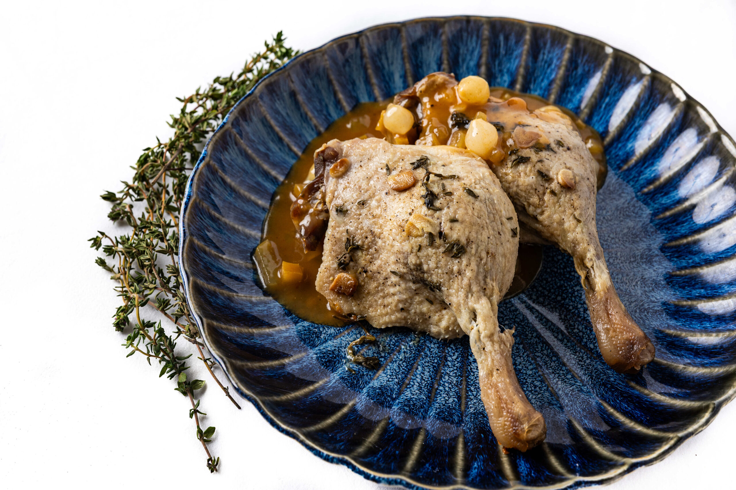 Dwie soczyste nogi z kaczki, wolno pieczone z cząstkami jabłek i cebulką perłową. Delikatne mięso, które samo odchodzi od kości, zamknięte w hermetycznym opakowaniu z aromatycznym sosem własnym. Gotowe do szybkiego podgrzania.