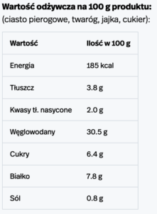 Gluten (pszenica), mleko (twaróg, śmietana, masło), jajka. Może zawierać śladowe ilości soi, selera, gorczycy, orzechów (migdały) – w zależności od warunków produkcji.