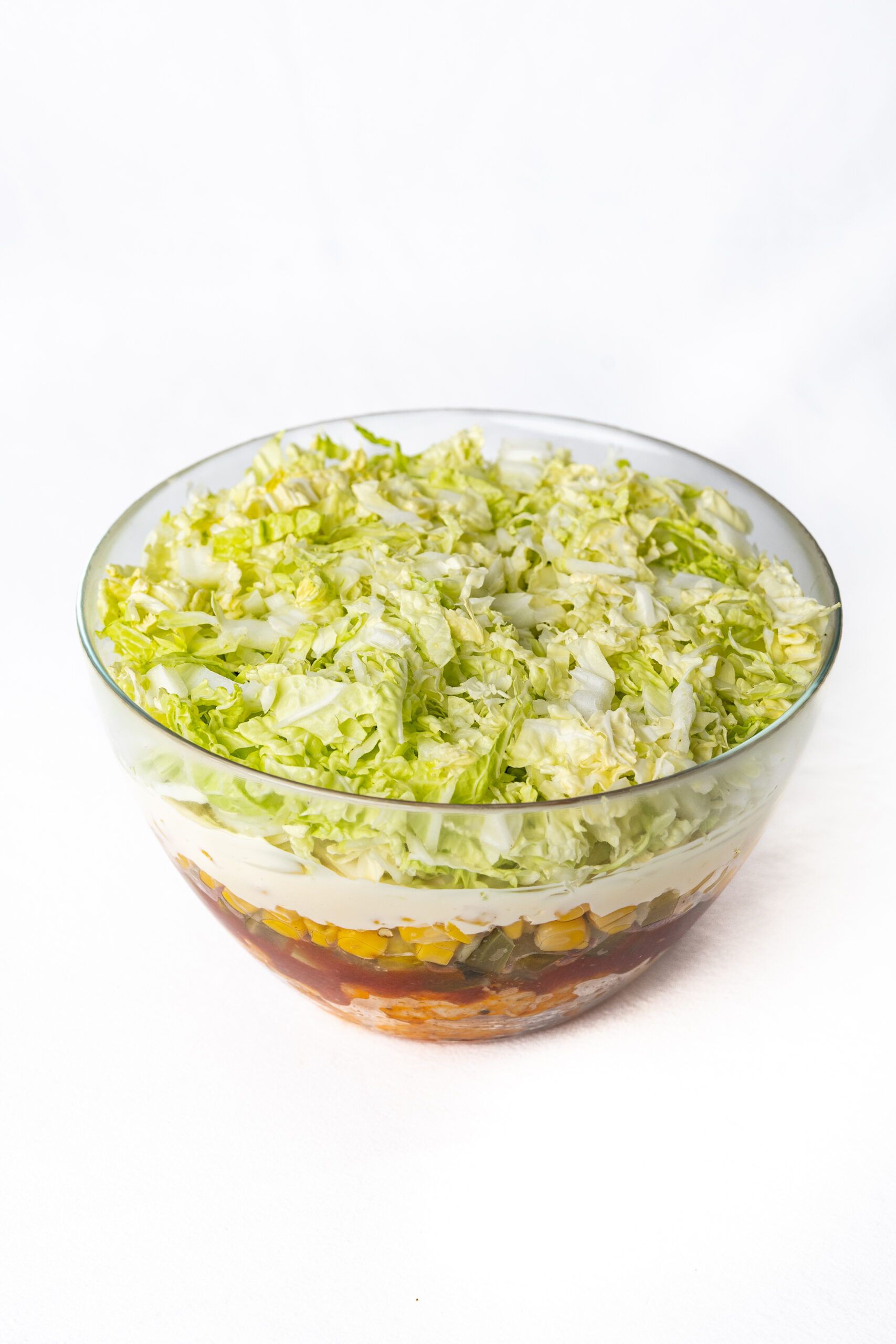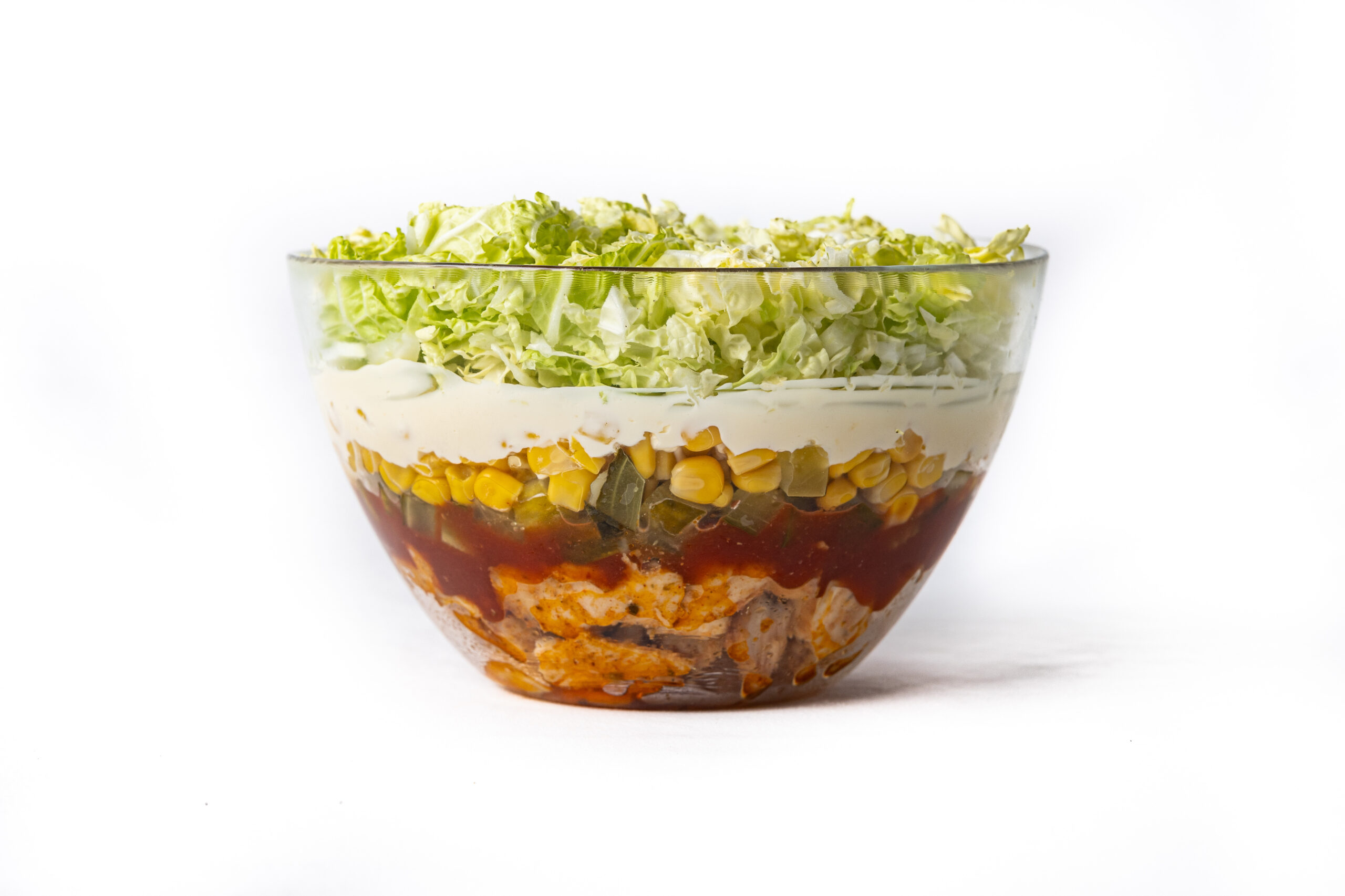 Kultowa sałatka warstwowa z aromatycznym, grillowanym kurczakiem w przyprawie gyros, chrupiącą kapustą pekińską, ogórkiem konserwowym i słodką kukurydzą. Całość dopełnia gęsty sos na bazie majonezu i ketchupu. Produkt świeży, gotowy do spożycia.
