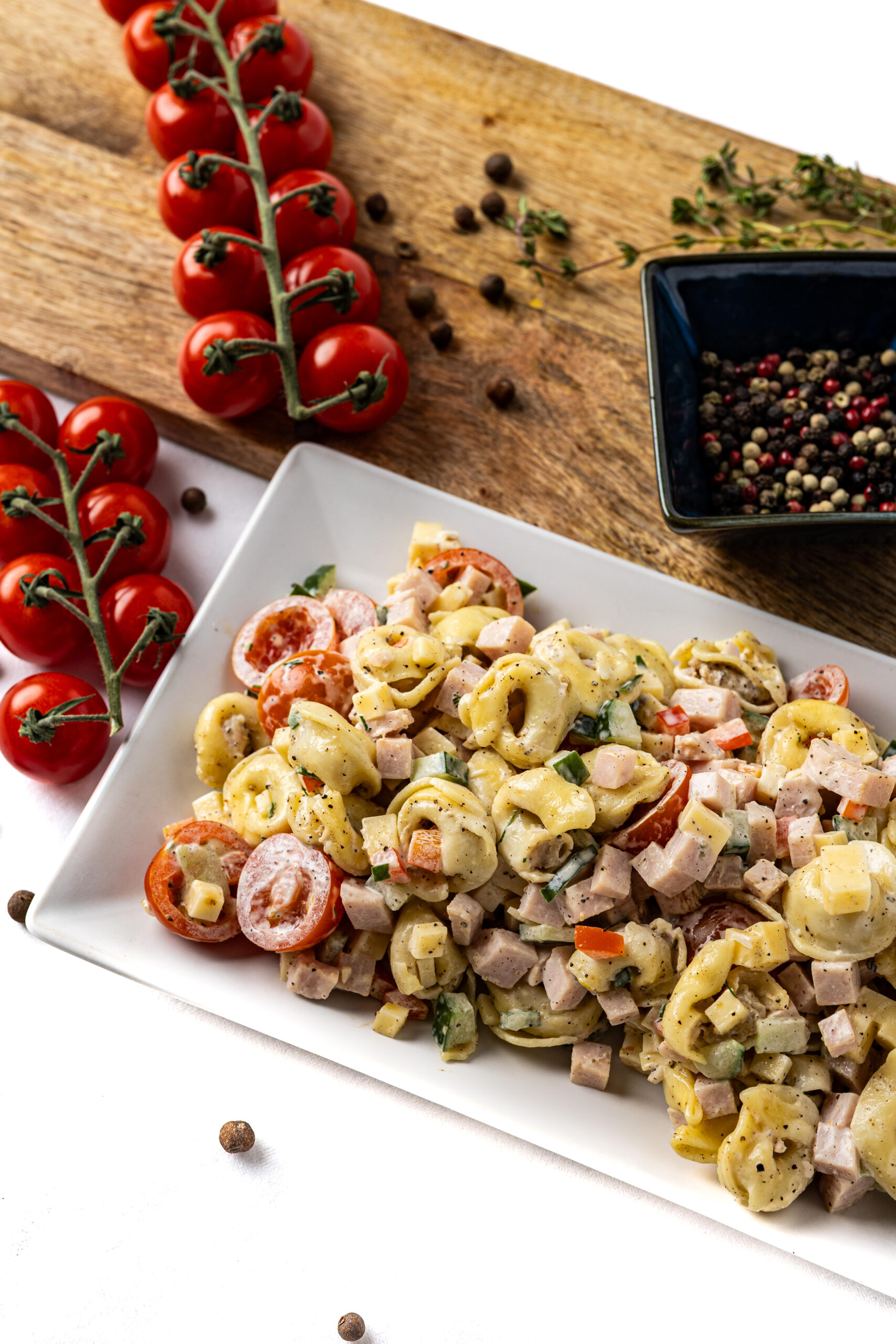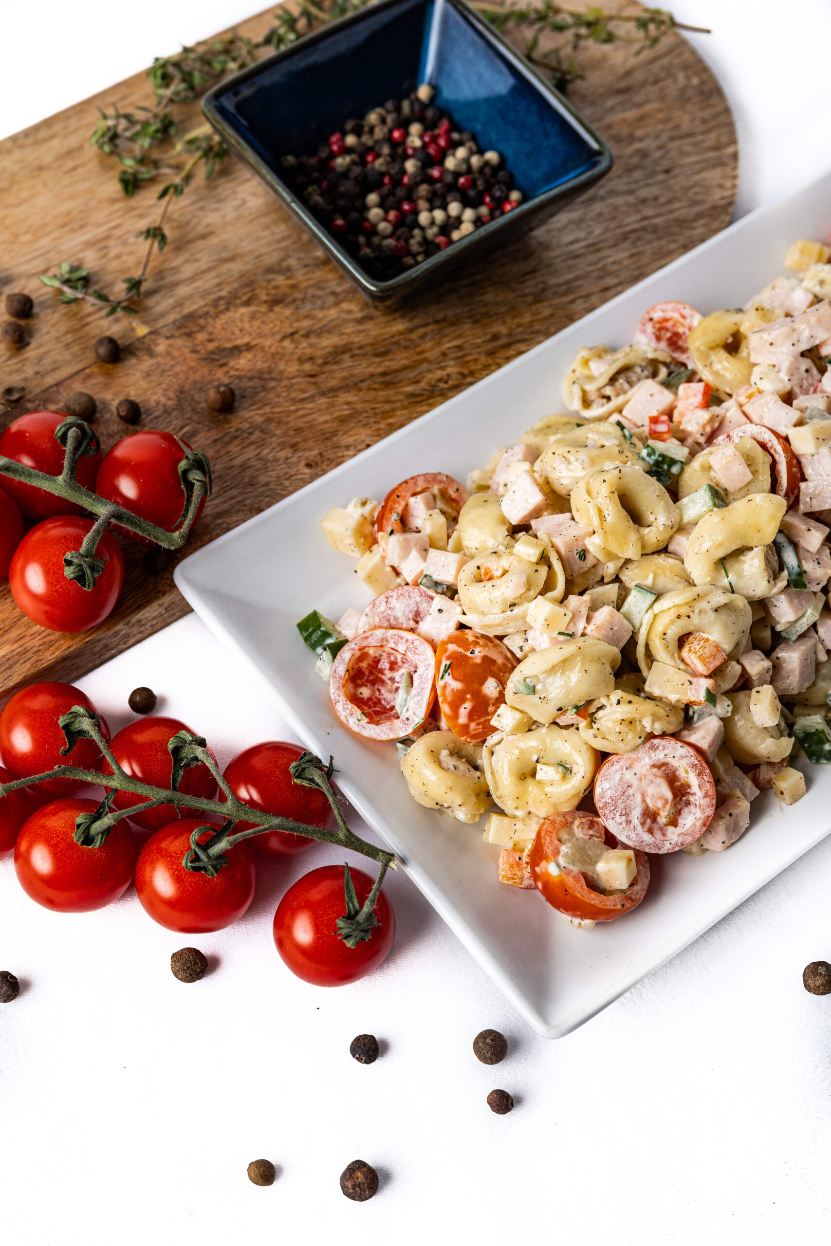 Sycąca sałatka z makronem tortellini, szynki konserwowej i żółtego sera z dodatkiem papryki, ogórka i pomidorków koktajlowych. Całość połączona kremowym majonezem. Produkt świeży, gotowy do spożycia.